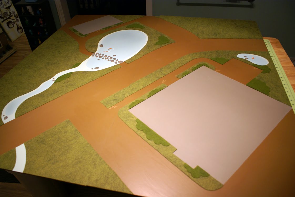 I had a very productive Thanksgiving weekend. I managed to finish all the gifts that I had planned on making. One of which is this play mat for Violet. It's made of two sheets of 2x4 1/4" masonite. I made it to go along with her christmas gift which is the big Calico Critters house. The Calico Critters web site shows all the houses and playsets set in surroundings with trees and roads and I thought that would be really cute to make. Her play mat has a lake with a creek that will have a bridge (haven't made that yet), a small pond, grass, a rock path, bushes, and two large trees. I used leftover house paint from our many projects to paint the roads, sidewalks and water. The grass and bushes are wool felt.
